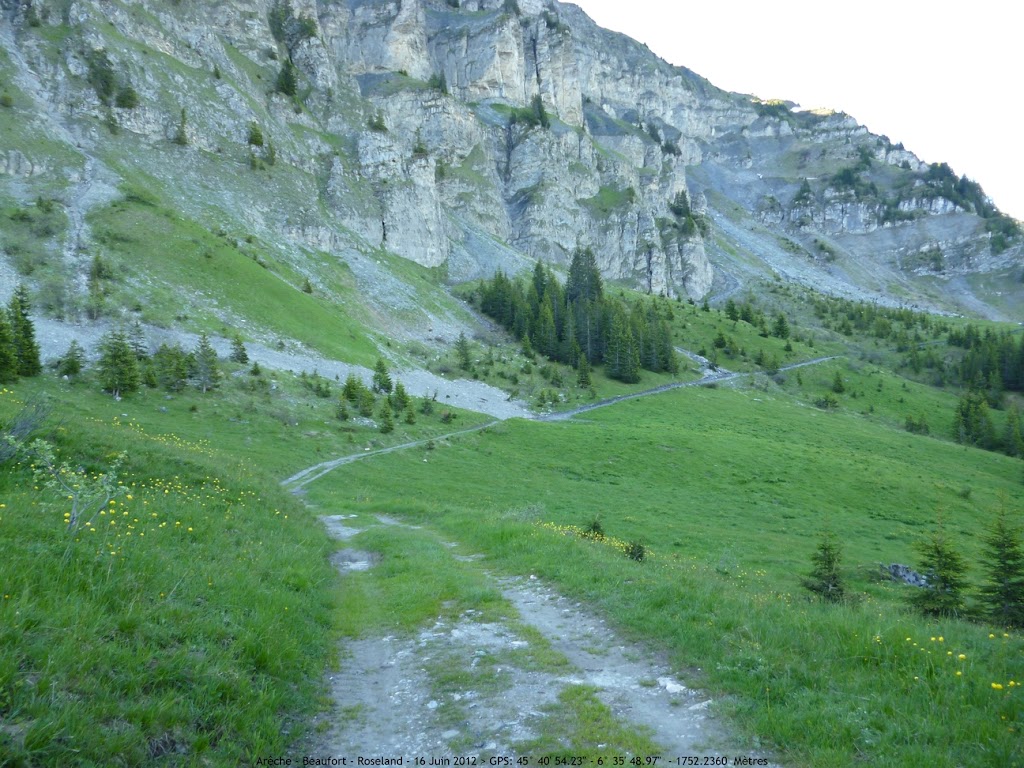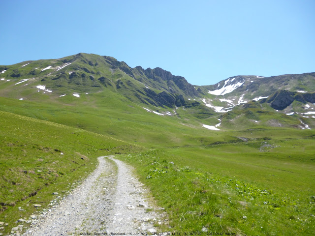 La Rando consistait à passer le col du Pré, puis à filer plein SUD sur le sentier botanique pour rejoindre le Lac de Saint Guérin. De là, nous remonterions de 1000 mètres pour franchir le col du Coin avant de redescendre sur Roselend. La solution de contournement sera le col du Couvercle qui , à 2300 mètres semble bien moins enneigé sur sont coté NORD. Pour le moment nous montons les derniers lacets avant d'arriver au col du Pré , la Pierra Menta est bien là , plein centre , le Lac de Roselend scintille au soleil , il fait environ 15 ° bref.. c'est le panard !