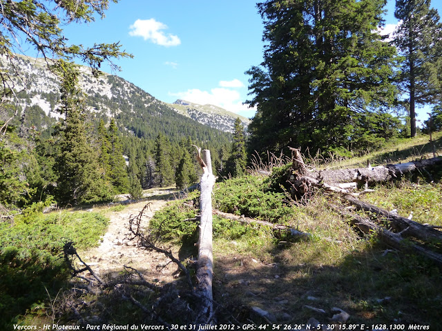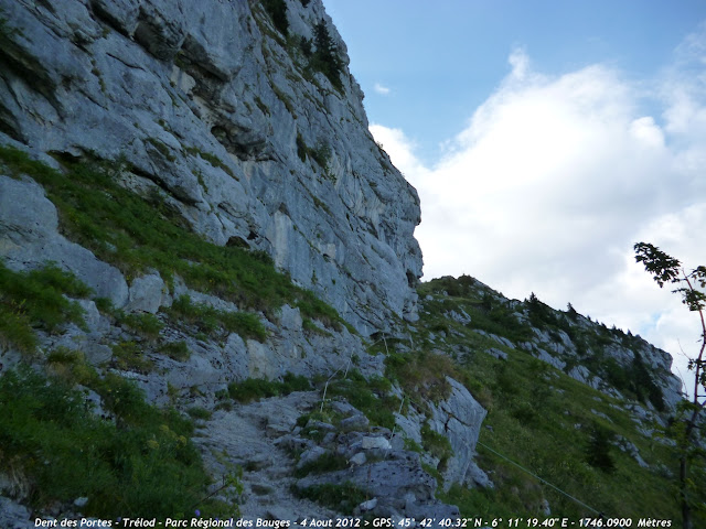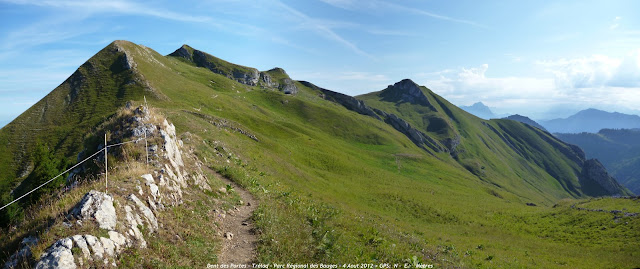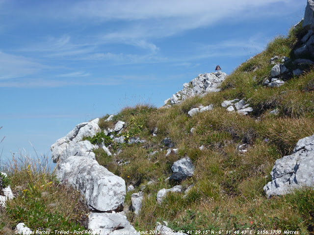 Le sentier est bien sec, et même s'il est coté T4 (difficulté max T5) c'est plutôt l'aspect aérien et l'exposition qui présente un risque . La pente herbeuse masquant un peu le danger d'une chute. Allez , je continue.