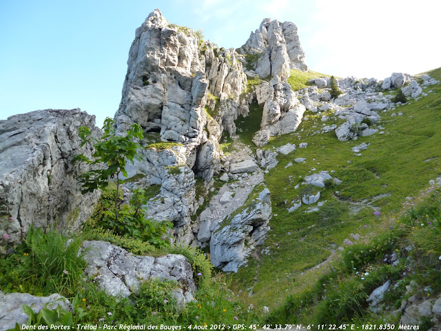 J'ai quitté le Reposoir depuis quelques minutes et aperçois le premier étage de la fusée : La Dent des Portes (juste au dessus du petit chalet)