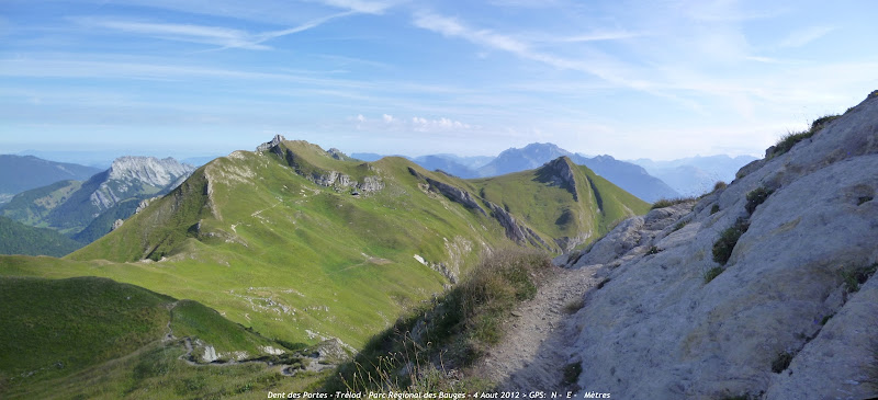 Vue sur le coté SUD , de gauche à droite: Sambuy , Chaurionde, Arcalod, Grand Roc, Mont de la Coche, Armenaz, Pécloz, Arlicots. En bas, tout en bas, le col de Chérel avec les premiers lacets qui redescendent dans la combe d'Ire à gauche et ceux qui filent sur Précherel à droite.