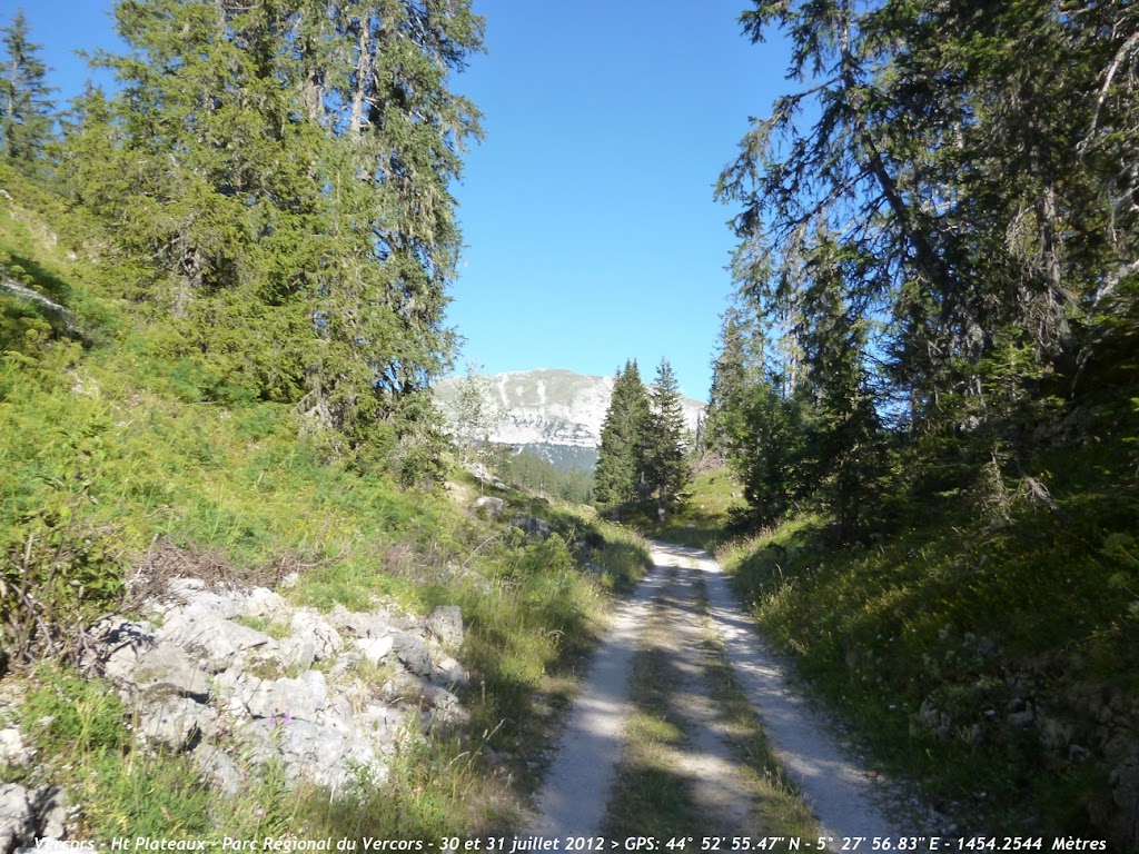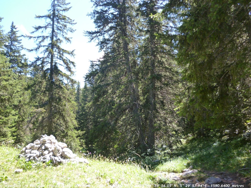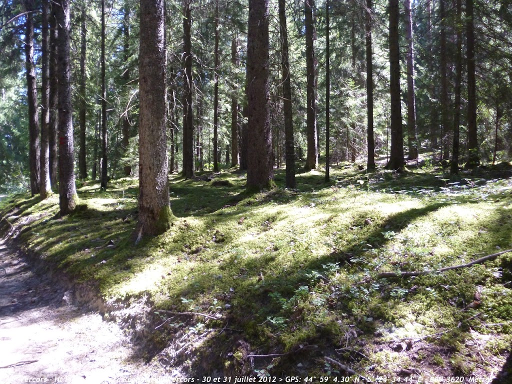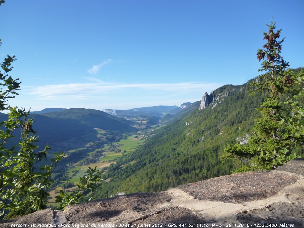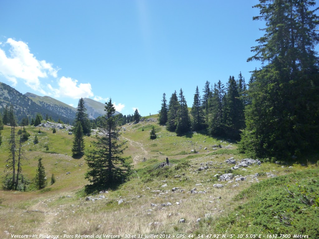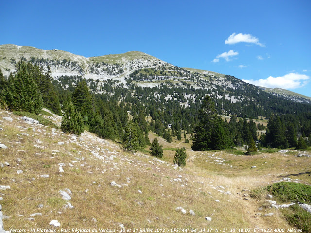 Après une bonne heure et demi de marche sur des sentiers très caillouteux nous sortons de la forêt et découvrons ce magnifique tableau . Le point culminant des Haut Plateaux est bien là ,sur la gauche: le Grand Veymont (2341m) et plus à gauche sur la photo ,