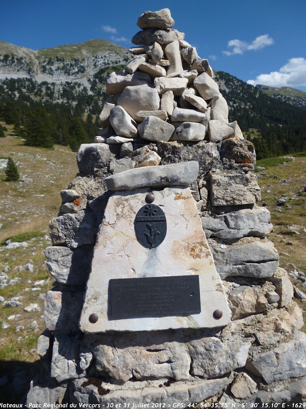 La stèle de création de la réserve biologique des Ht-Plateaux, à quelques centaines de mètres du refuge de la Jasse du Play.
