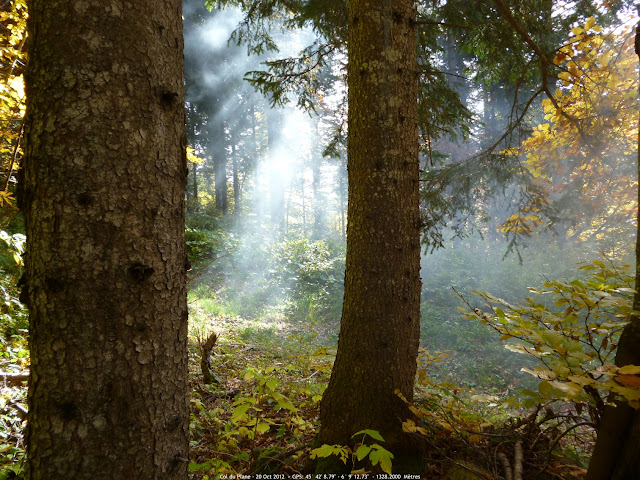 Samedi 20 Octobre: N'en déplaise à Météo France, la pluie annoncée en début de semaine c'est fait bien discrète et c'est même de belles étoiles qui parsèment notre ciel ce matin. Le VTT accroché à la voiture depuis hier soir, je file chercher OUTDOOR qui doit déjà m'attendre , frontale sur la tête. Rapide passage à Cusy avec le traditionnel arrêt "café croissant pain" et nous voila repartis dans mon taco roulant comme deux grands pères à la vitesse effarante de 30 à l'heure, à la recherche d'éventuels chevreuils, sangliers, ou renards profitant du calme des derniers moments d'obscurité. En réalité, nous ne croiserons pas âmes qui vivent à part un camion de lait visiblement bien plus pressé que nous....